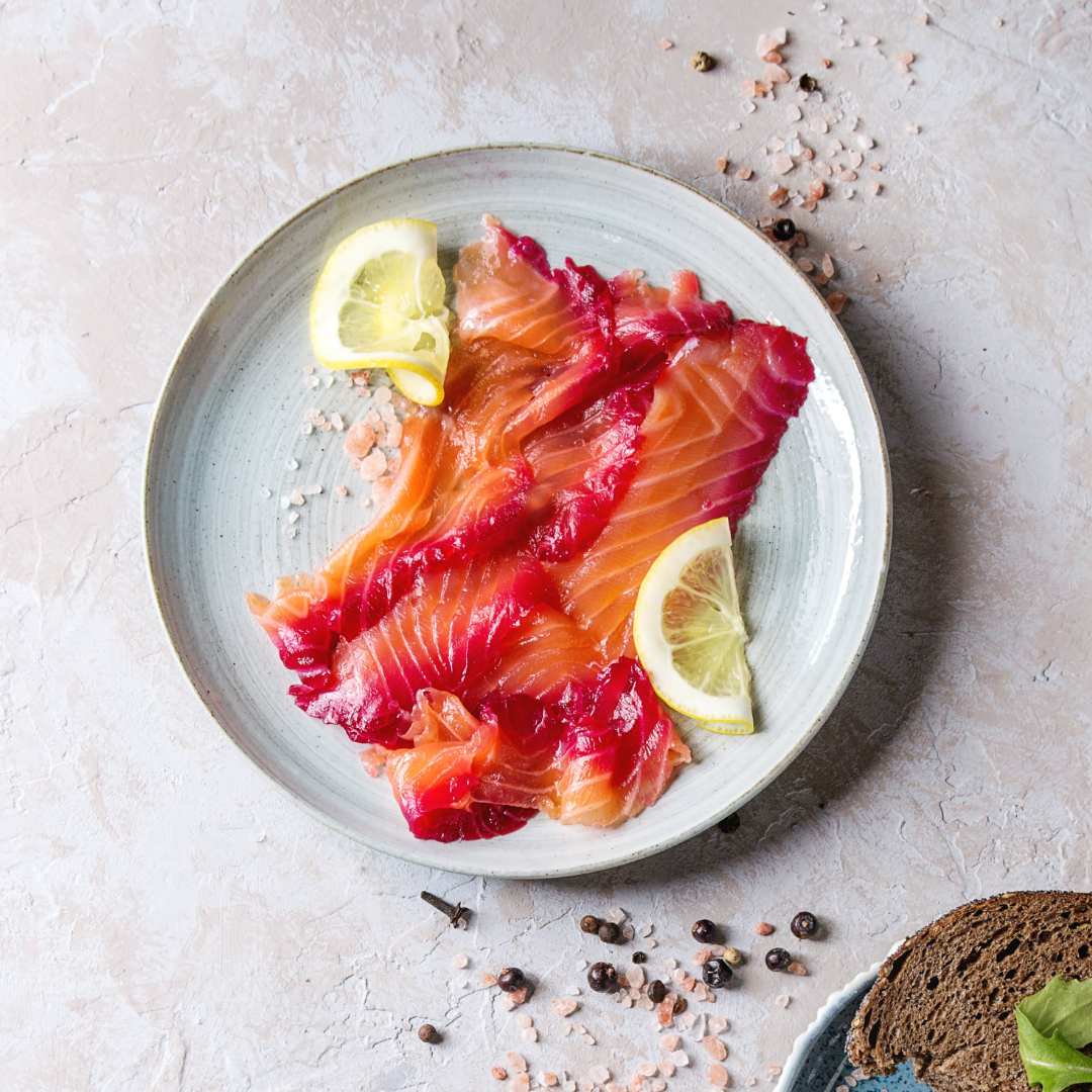 Fresh salmon, lightly smoked and expertly cured with the earthy flavour of beetroot, giving a naturally beautiful hue of purple against the salmon colour. Pairs very well with cucumber, red onion and lemon wedges. It is versatile and can be added to your breakfast, brunch or lunch table.