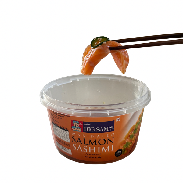 Home / Order Online / Marinated / Marinated Fresh Salmon Sashimi (Yuzu & Jalapeno) – 100g (5-7 pieces)